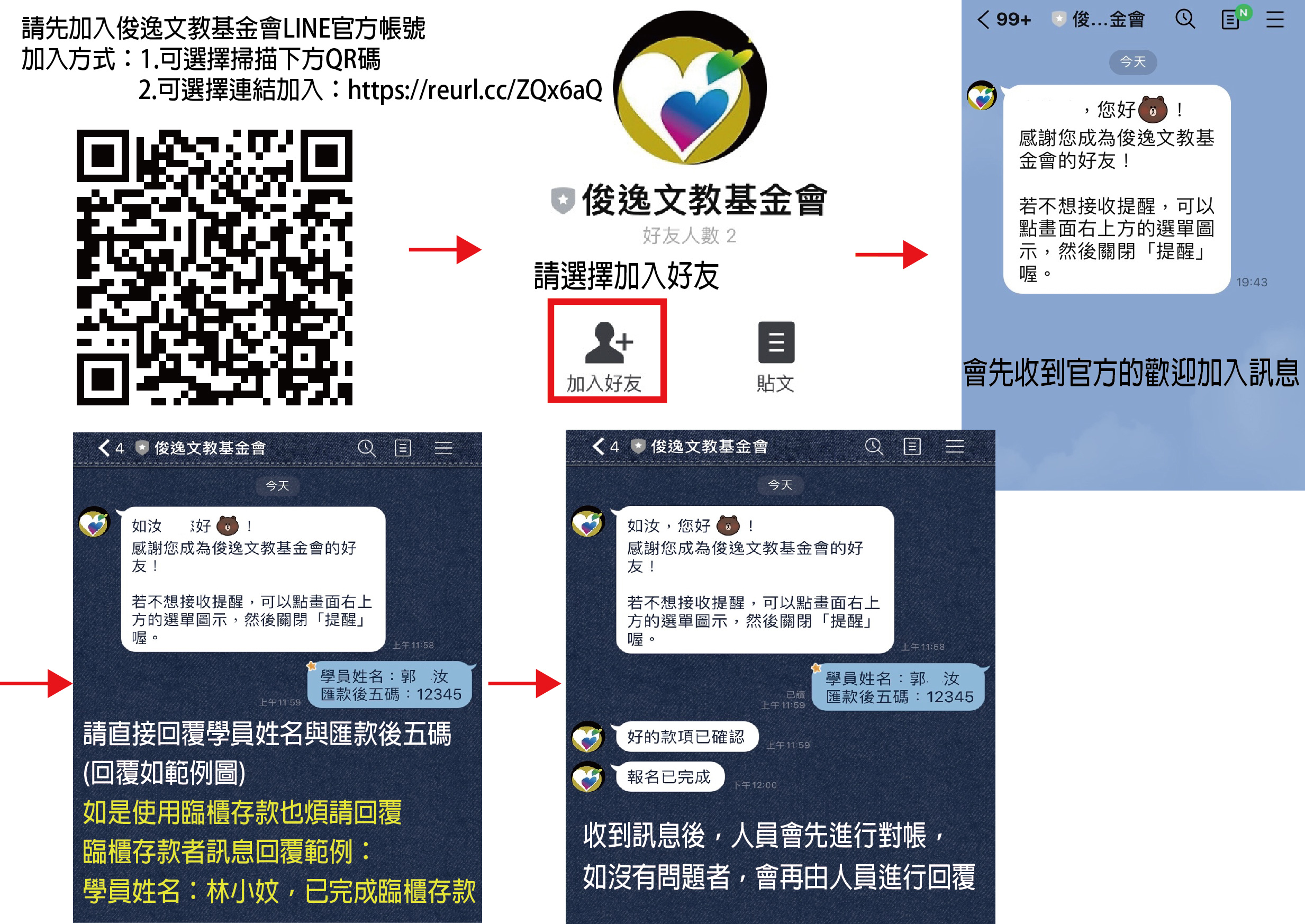 *匯款者,請先加入俊逸基金會LINE官方帳號後,並傳訊息告知學員名字與匯款帳號後五碼。