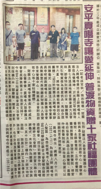 む民時新聞め安平貢噶寺讓愛延伸 普渡物資贈十家社福團體::俊逸文教基金會::