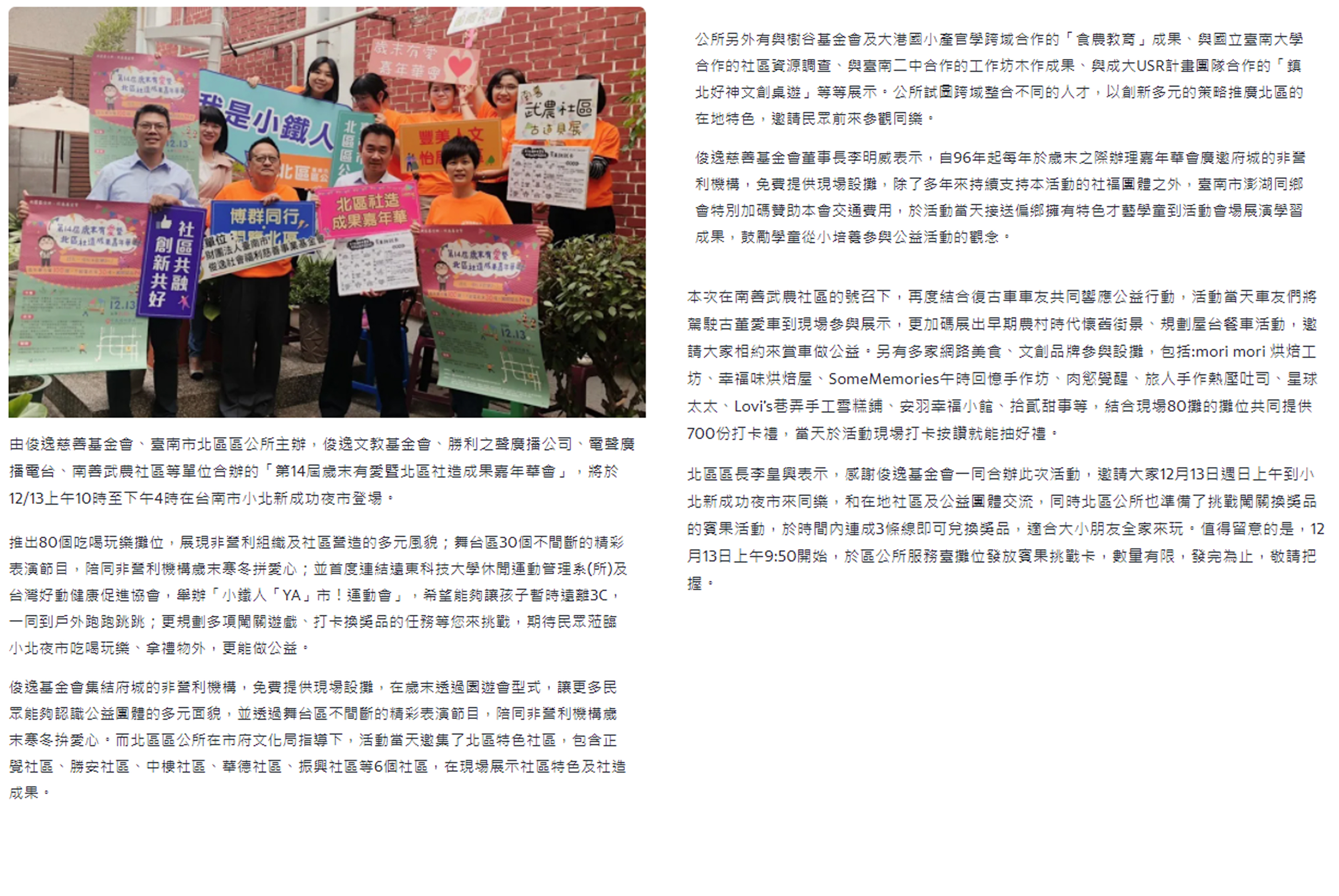 むYahoo奇摩新聞め俊逸歲末有愛暨北區社造成果嘉年華會 12/13台南小北夜市登場::俊逸文教基金會::