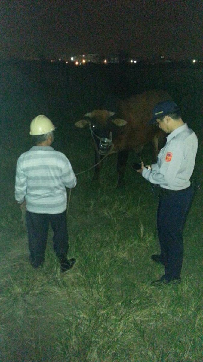 這隻年齡大約一歲多,體重700-800kg的未婚公黃牛,4日晚間因為狗兒咬斷牽繩因而逃脫,一直駐足在新開幕的丹丹漢堡對面車道上,經新市分駐所巡邏員警戴大盛向附近店家詢問牛隻為何人所養及一一訪查後得知飼主為住在新市區三舍的王o陽先生,趕緊通知領回。
