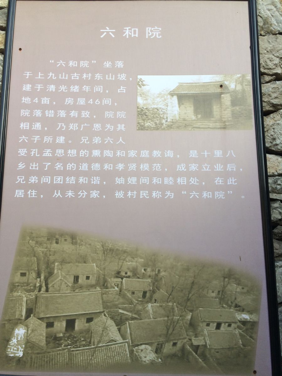 《上九山》是中國北方規模最大、最原始的古村落,號稱:孔孟民俗第一村,古村座落於兩山之間,佔地270畝,內有明清建築風格古屋300多套。受到伏羲文化和儒家文化的影響,現有許多文化古蹟,例如:娘娘廟、秦皇古道、蕭進士院、老學堂、鄭家六合院、古戰臺、各類手作工坊店鋪等...。