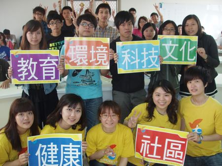 青輔會台南市青年志工中心青年自主團隊校園說明會,週一99/3/22於崑山科技大學登場,台南市青年志工中心志工及與會同學們手持社區、環境、文化、科技、健康、教育六大服務面向告示牌,宣告青年自主團隊校園說明會起跑。