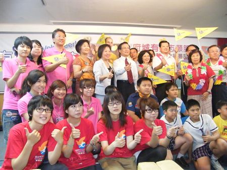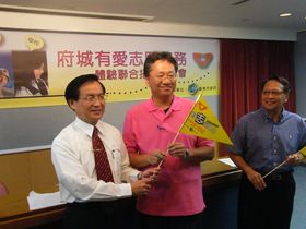 有志逗陣來府城有愛志願服務體驗記者會上午舉行,台南市長許添財授旗給承辦單位俊逸慈善基金會執行董事李明威、臺南市社區暨志願服務推廣中心主任盧禹聰和中華民國道德重整協會秘書長歐陽惠芳,以及今年將成為志願服務種子學校計劃的八所國中小校長、代表。許添財市長也呼籲各界特別是學校、家長可以鼓勵孩子投入志願服務行列。