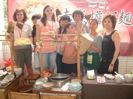 由俊逸文教基金會今年暑假與金車教育基金會合作,97/8/5至97/8/8於台南市進學國小舉辦「府城快樂美語營」,邀請美國華盛頓州長青學區國際志工擔任講師。經過幾天的美語教學服務,志工們即將返美。由於這群美國華盛頓州長青學區的志工們,未到台灣時即耳聞府城「赤崁擔仔麵」,但一直苦無機會品嚐,因此主辦單位得知後,在他們離台前,特別商請赤崁擔仔麵當家曾鳳玉小姐將台南小吃移師至營隊服務現場,好讓這群國際志工嚐鮮,大快朵頤。
