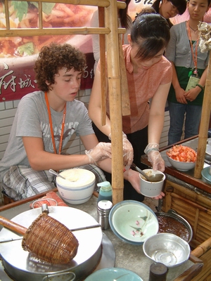 十五歲的ALEX還現場學習怎麼煮擔仔麵,煮好了,美國華盛頓州長青學區督學Carol女士和幾位國際志工,就直接在麵攤旁吃了起來,就像傳統台南人的吃法,別有一番古味。ALEX說,煮擔仔麵是一個步驟一個步驟來,其實並不困難。這次他不但吃到擔仔麵,還吃到自己煮的擔仔麵,真是很難得的經驗。而擔仔麵不但香,還有豐富的肉燥醬料,真的很好吃。