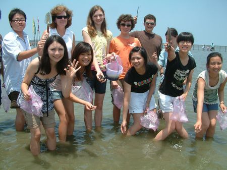俊逸文教基金會、金車教育基金會今年暑假邀請一群來自美國的國際志工到台南服務,服務結束即將返美的年輕志工,在主辦單位及台南縣政府的招待下,週六97/8/9前往七股潟湖六孔碼頭赤嘴園摸赤嘴仔,體驗早期台灣人摸蛤仔兼洗褲的心情。