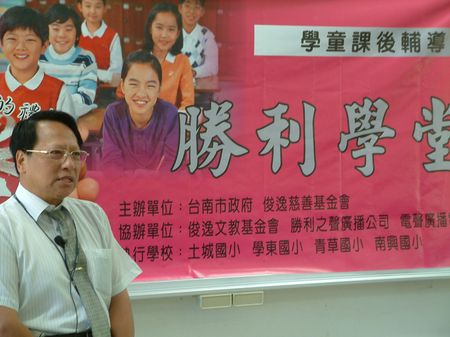 俊逸慈善基金會「勝利學堂」弱勢學童課輔計劃即將投入台南市安南區服務,「勝利學堂」課輔志工今天96/7/2也在土城國小正式成軍,並奉茶拜師,由土城國小校長黃俊傑、南興國小魏銀河代表接受課輔志工的奉茶。