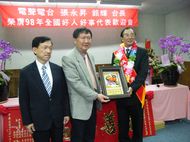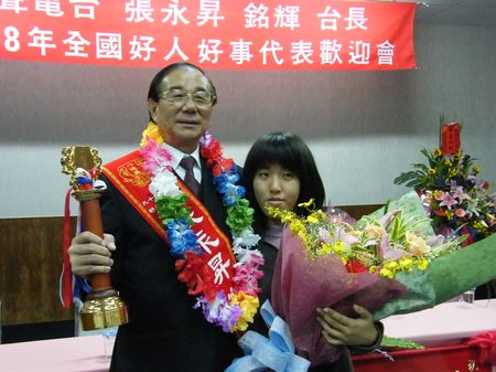 電聲廣播電台台長銘輝(本名:張永昇),榮膺98年全國好人好事代表八德獎的殊榮,週六98/12/26上午於勝利之聲廣播公司為其舉辦的歡迎會中,長期受銘輝台長資助的崑山科大一年級李姿瑩同學特別獻花給銘輝台長祝賀,場面感人。