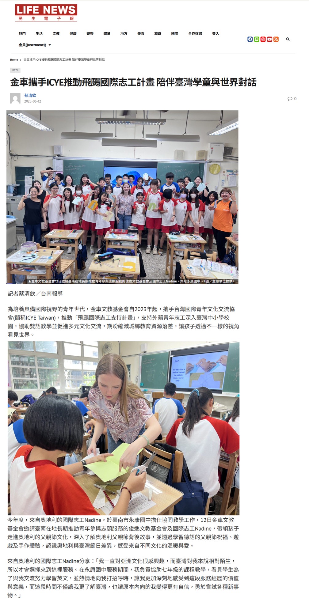 む民生電子報め金車攜手ICYE推動飛颺國際志工計畫 陪伴臺灣學童與世界對話::俊逸文教基金會::