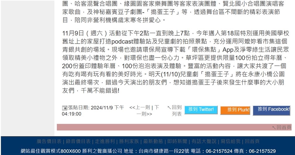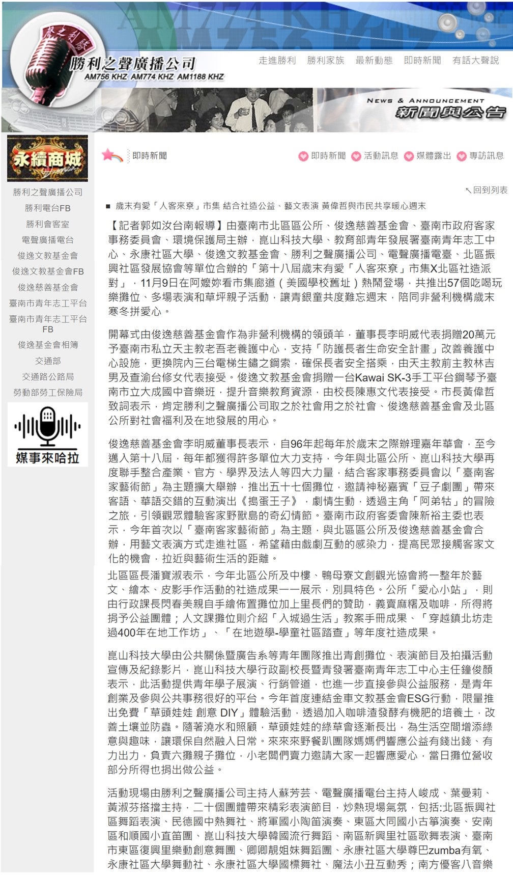 【財團法人俊逸文教基金會】【財團法人臺南市俊逸社會福利慈善事業基金會】【臺南市青年志工平台】台南市70052中西區健康路一段22號 TEL:06-2157524 FAX:06-2157529 e-mail:victory.radio@msa.hinet.net最佳瀏覽解析度 1024X768 (Internet Explorer6.0以上)Copyright 2007[財團法人俊逸文教基金會] [財團法人臺南市俊逸社會福利慈善事業基金會]All Rights Reserved.