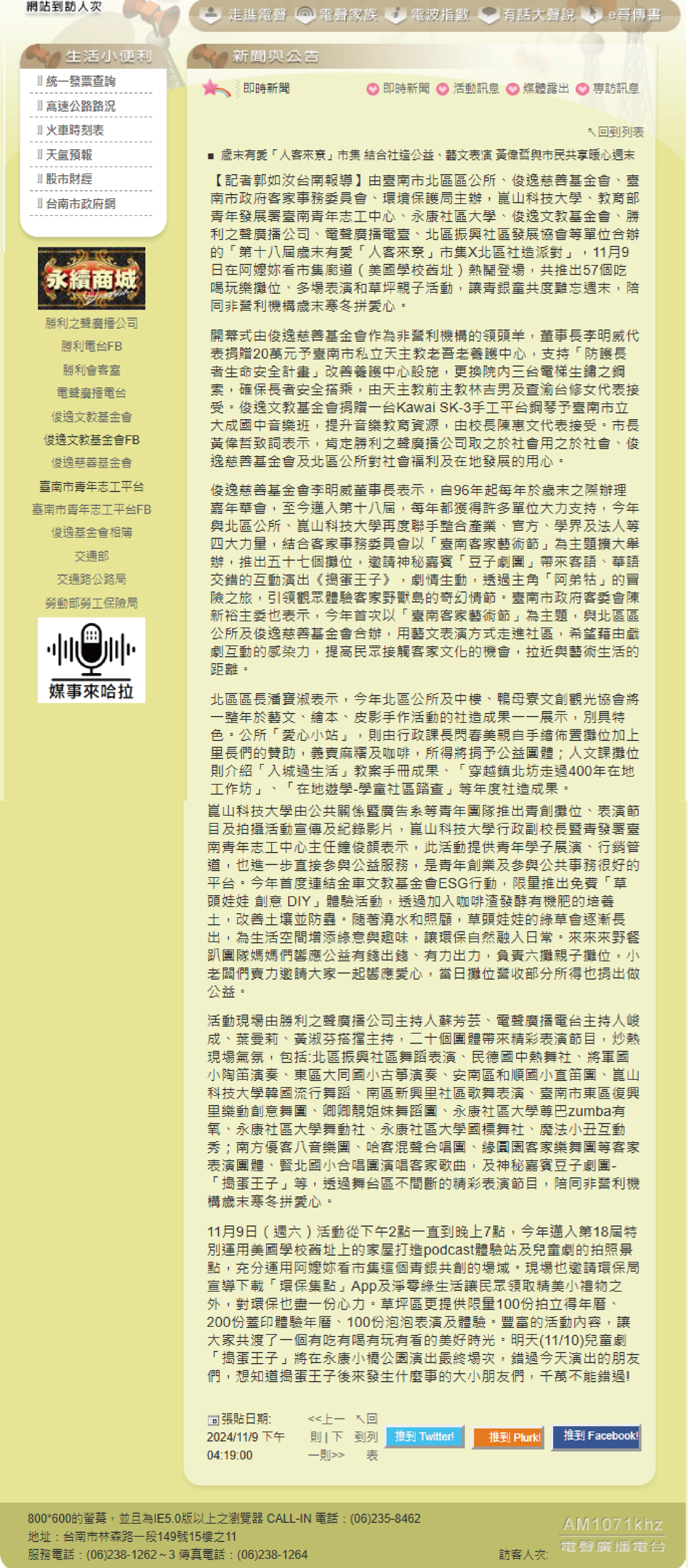 【財團法人俊逸文教基金會】【財團法人臺南市俊逸社會福利慈善事業基金會】【臺南市青年志工平台】台南市70052中西區健康路一段22號 TEL:06-2157524 FAX:06-2157529 e-mail:victory.radio@msa.hinet.net最佳瀏覽解析度 1024X768 (Internet Explorer6.0以上)Copyright 2007[財團法人俊逸文教基金會] [財團法人臺南市俊逸社會福利慈善事業基金會]All Rights Reserved.