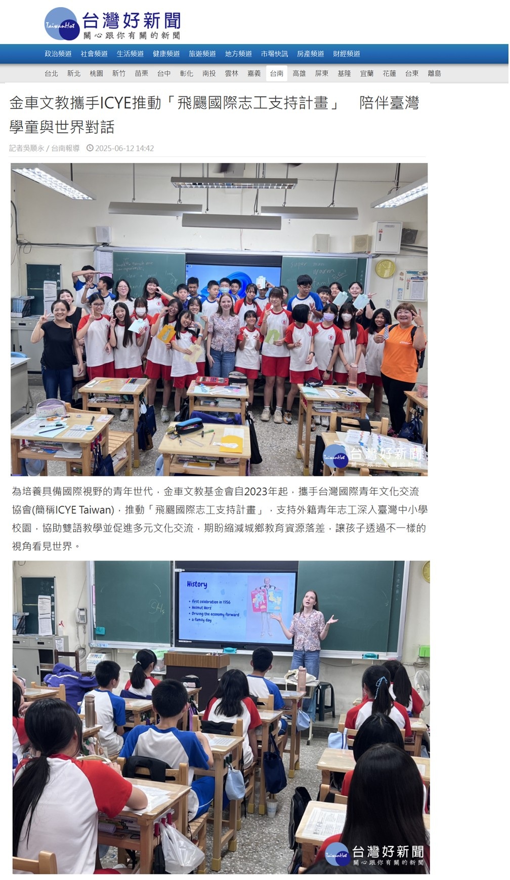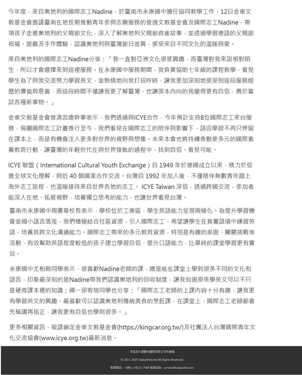 新聞來源:https://www.taiwanhot.net/news/focus/1105124/%E9%87%91%E8%BB%8A%E6%96%87%E6%95%99%E6%94%9C%E6%89%8BICYE%E6%8E%A8%E5%8B%95%E3%80%8C%E9%A3%9B%E9%A2%BA%E5%9C%8B%E9%9A%9B%E5%BF%97%E5%B7%A5%E6%94%AF%E6%8C%81%E8%A8%88%E7%95%AB%E3%80%8D+%E9%99%AA%E4%BC%B4%E8%87%BA%E7%81%A3%E5%AD%B8%E7%AB%A5%E8%88%87%E4%B8%96%E7%95%8C%E5%B0%8D%E8%A9%B1/57/%E5%8F%B0%E5%8D%97