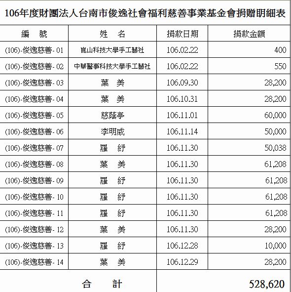 財團法人臺南市俊逸社會福利慈善事業基金會106年捐贈責信::俊逸文教基金會::