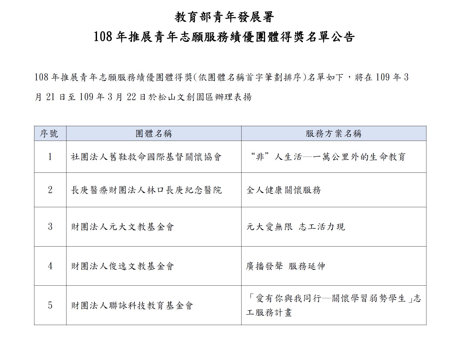 榮獲教育部青年發展署推展青年志願服務績優團體