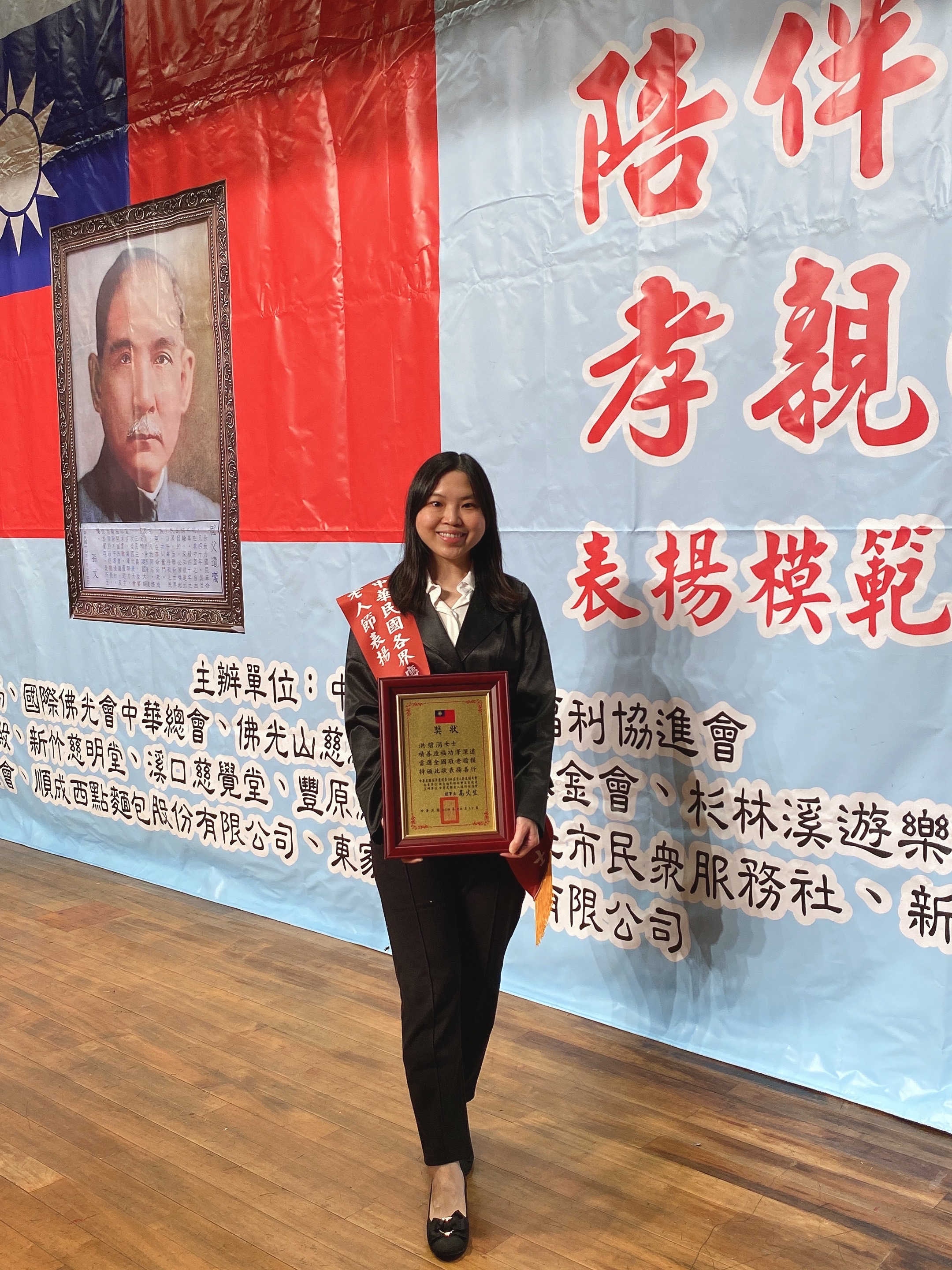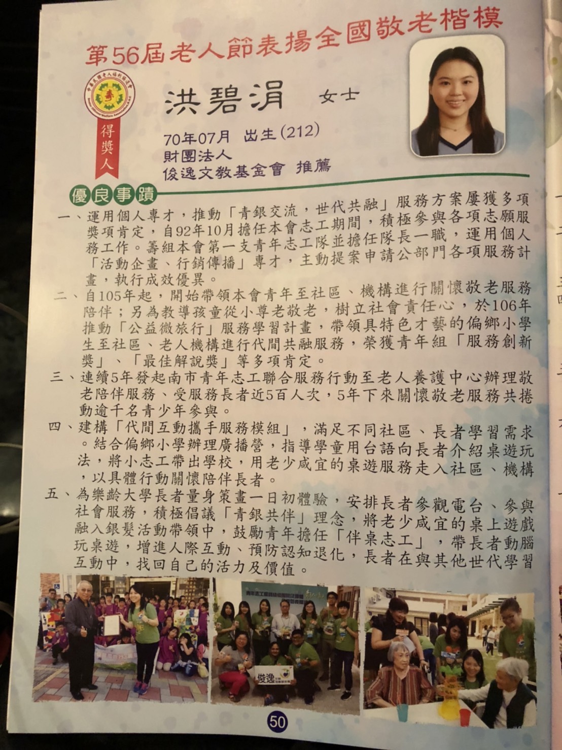 勝利之聲廣播公司洪碧涓榮獲衛生福利部「中華民國第56屆老人節」全國敬老楷模(全臺18名)