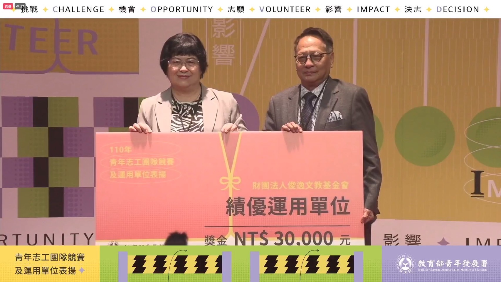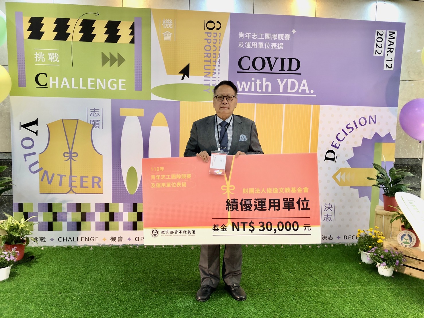 俊逸文教基金會連續五年榮獲教育部青年發展署推展青年志願服務績優團體,並拿下110年教育部青年發展署教育業務志願服務績優運用單位獎勵及110年度教育部社會教育貢獻獎。受疫情影響此次共計有62隊報名,1千多人參與,其中39支團隊、4個團體脫穎而出進入決賽,成為青年志願服務的標竿,入選團隊111312日於台北進行決選並舉行表揚典禮,教育部青年發展署陳雪玉署長親臨頒獎,由俊逸文教基金會獲頒績優團體獎金3萬元,由執行長李明威代表接受。