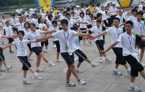 八號清晨六點多在福建會堂前廣場,擠滿來自台灣參加「陽光海峽∼兩岸快樂小天使交流活動」的小朋友與當地學童共同學習打一套詠春拳為本次活動所設計重點之一。