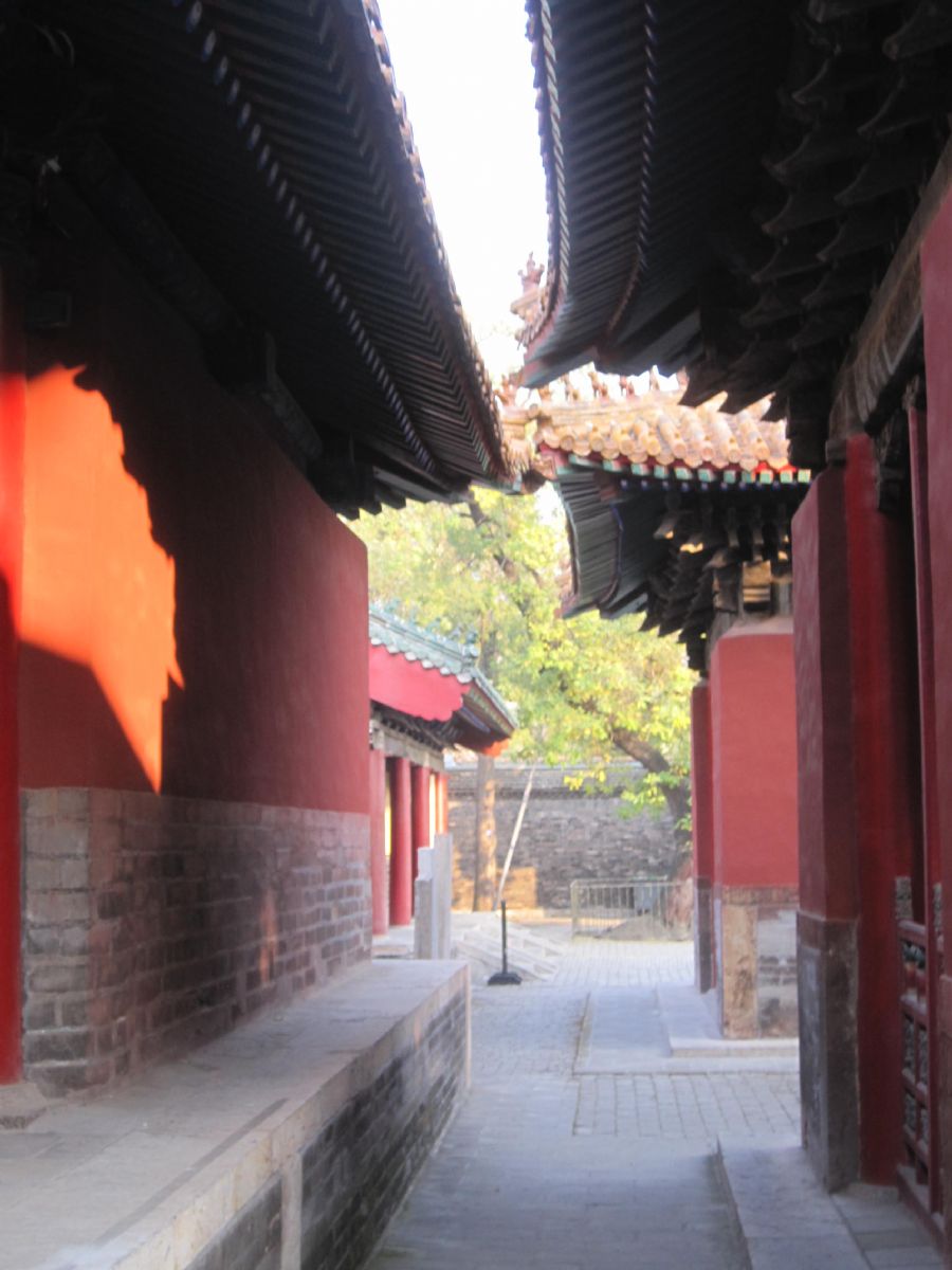 在「孔廟」有一特殊建築-碑亭,這個區域的建築,因為飛簷的簷與簷緊咬,像雄雞相鬥,啄對啄互不相讓,這就是人稱"鬥角";再者,一個飛簷直插另一個 飛簷的"心窩",另一飛簷又橫刺別的飛簷"肩夾",這便是"勾心"。這種特殊的建築型式。流傳至今也成為“勾心鬥角”的特殊建築形式。