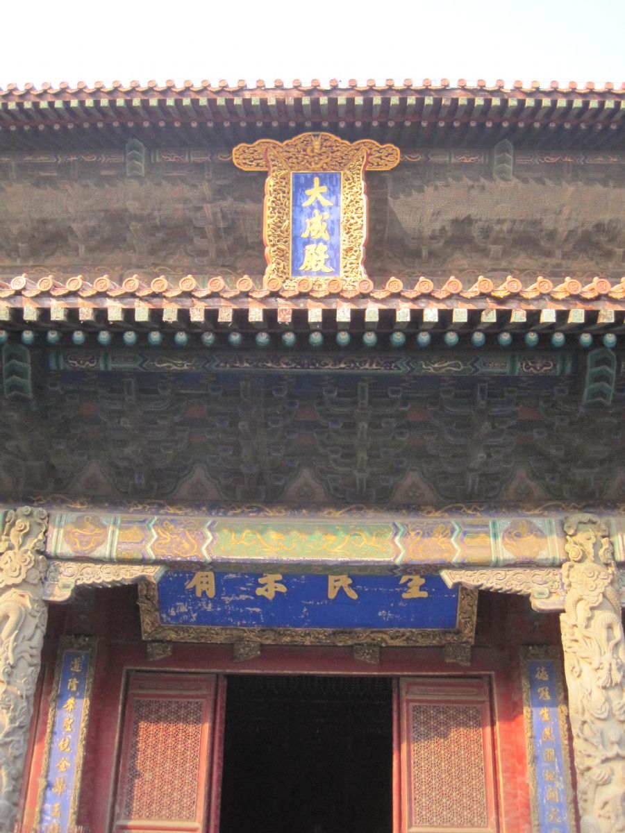 「孔廟」正殿「大成殿」,「大成」二字出自於孟子對孔子思想的讚揚,「大成」的意思是孔子的思想聚集了他的先人堯、舜、禹、湯、文武周公的思想,和儒家所創建的孝、悌、仁、愛結合在一起,達成了儒家的完美。