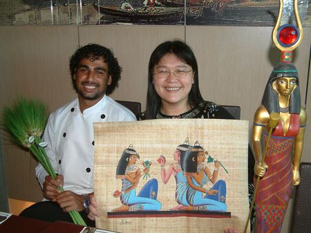 對埃及相當熟稔的「BOSA埃及之吻」主題餐廳女主人張尹瑛,藉由投影片方式,以埃及的各大城市與知名景點為背景,貼近埃及人的生活,展現世界熱門景點-埃及的魅力。她表示,莎草紙已經有超過五千年的歷史,幾乎每個到埃及的人,多少都會帶一點相關產品當做伴手禮,這次活動也選擇莎草紙做為主角。莎草是一種生長在尼羅河畔的植物,埃及人取其莖切成薄片製成紙張,紙張中清晰可見莎草纖維紋路。由於莎草的纖維相當堅韌,上色或書寫後,彩墨也不易褪色,因此許多埃及幾千年的文獻都因此完整保存下來。張尹瑛說,現在在世界上許多博物館裡的埃及文獻,其書寫紙張就是莎草紙,而埃及人可以說相當保護他們的製紙技術,在技術秘方不外流的原則下,要想拿到莎草紙,只能從埃及進口。