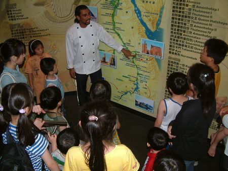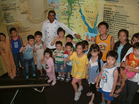 「小朋友,埃及的金字塔不是外星人蓋的,是埃及人建造的哦!」一場古埃及文化親子體驗活動週六96/7/7下午二點三十分於「BOSA埃及之吻」主題餐廳登場,餐廳男主人埃及藉的馬慕德特別現身向小朋友澄清許多人的對金字塔的迷思,也驕傲的向大家介紹古埃及人的工藝技術之超高。