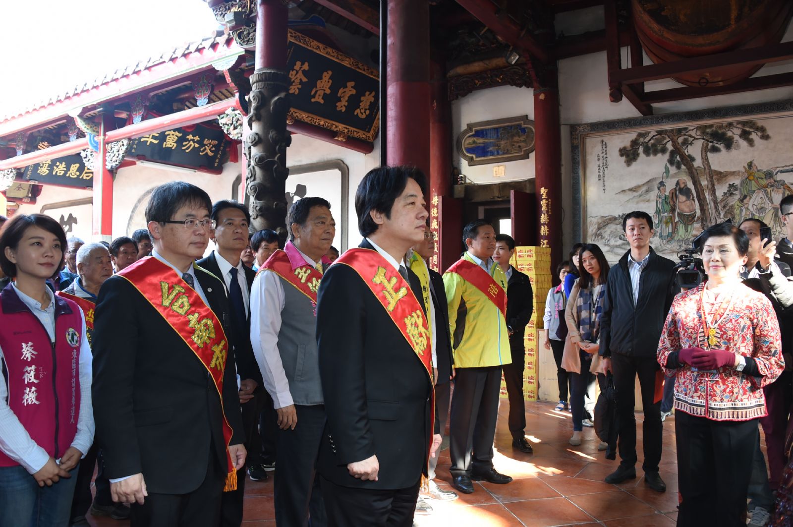 稍早,賴院長到「台灣祀典武廟」與「大天后宮」參拜祈福時表示,此行主要為落實蔡英文總統的「前瞻基礎建設」及「長照2.0」兩大政策。「前瞻基礎建設」除滿足下一世代對基礎建設的需求外,也可擴大政府支出,帶動民間投資,讓經濟發展與進步。
