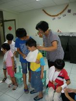 「如果需要固定傷口,可以利用三角巾進行包紮,像是頭部包紮法、八字包紮法和三角巾包紮法都很實用哦。」俊逸基金會週三99/8/4上午,帶領位九位健康志工前往台南縣關廟鄉天宮育幼院與十多位院童同樂,並進行小小護理站、腸病毒登革熱等健康觀念宣導以及洗手健康操帶動唱等一系列健康宣導課程,院童在健康青年大使的教導,院童們個個都成了小小包紮高手。