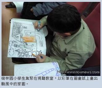 樹林國小學生集聚在視聽教室,以彩筆在圖畫紙上畫出颱風中的家園,畫作中可見一包包的沙包擋水、大雨一直下、大水淹沒房屋及民眾、國軍搶救的種種過程,猶如八八風災情景再現。