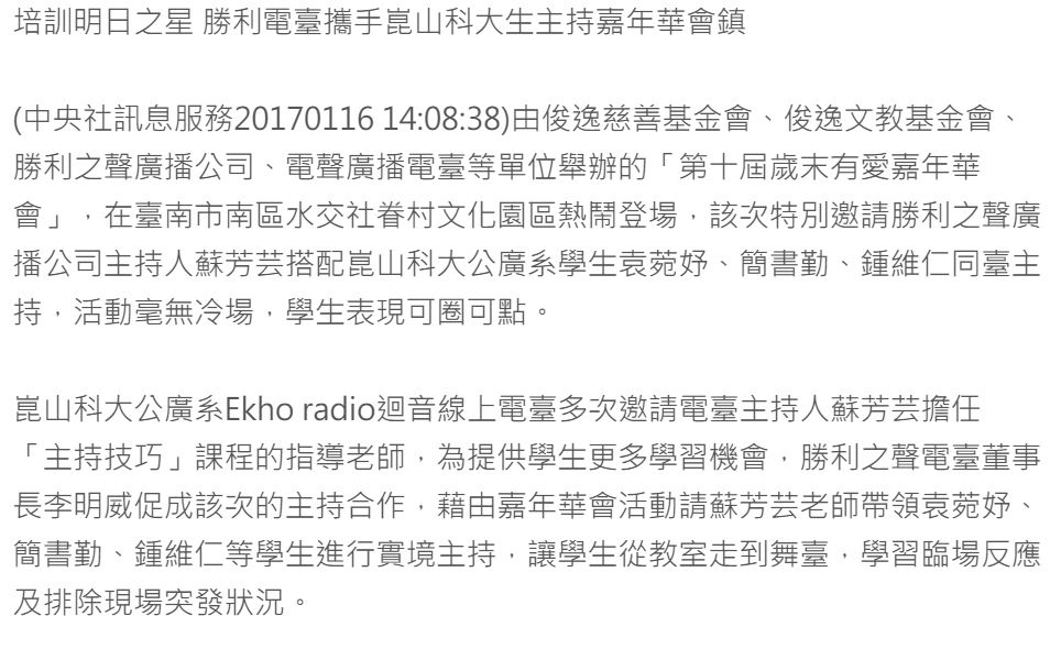【財團法人俊逸文教基金會】【財團法人臺南市俊逸社會福利慈善事業基金會】【臺南市青年志工平台】台南市70052中西區健康路一段22號 TEL:06-2157524 FAX:06-2157529 e-mail:victory.radio@msa.hinet.net最佳瀏覽解析度 1024X768 (Internet Explorer6.0以上)Copyright 2007[財團法人俊逸文教基金會] [財團法人臺南市俊逸社會福利慈善事業基金會]All Rights Reserved.