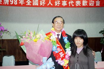 【記者廖璟華南市報導】本名張永昇的電聲廣播電台台長「銘輝」,榮膺98年全國好人好事代表八德獎的殊榮,昨(26)日上午,該電台為他舉辦盛大的慶祝會,會中長期受銘輝台長資助的崑山科大一年級同學李姿瑩,特別獻花給銘輝台長祝賀,在熱鬧的氣氛中,還有感人的場面。