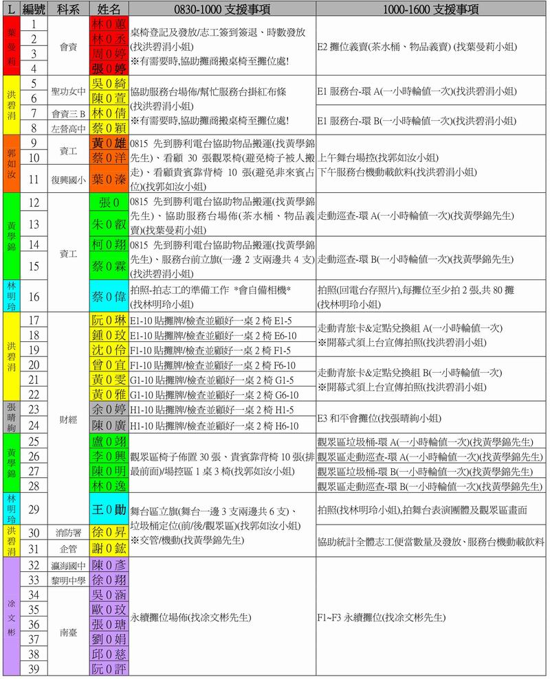 ※姓名底色的顏色,即為報到當天核發的志工臂章顏色。