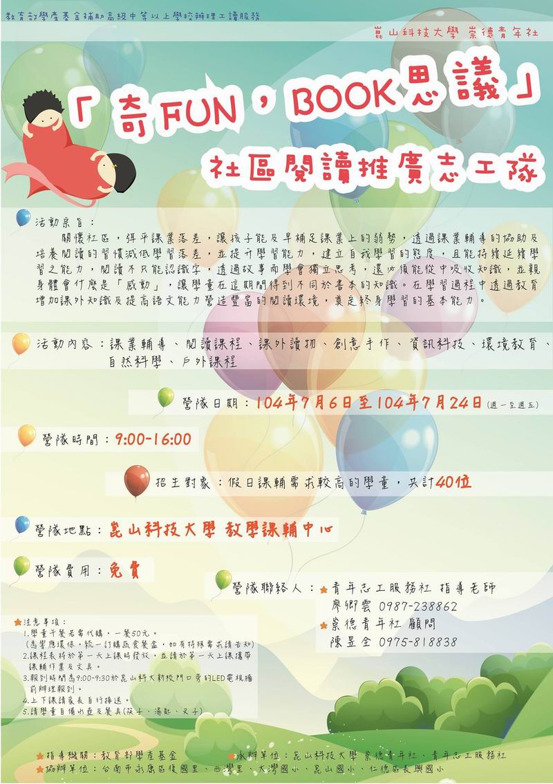 營隊日期:104年7月6日至7月24日(週一至五)9:00-16:00; 營隊地點:崑山科技大學教學課輔中心; 營隊費用:免費