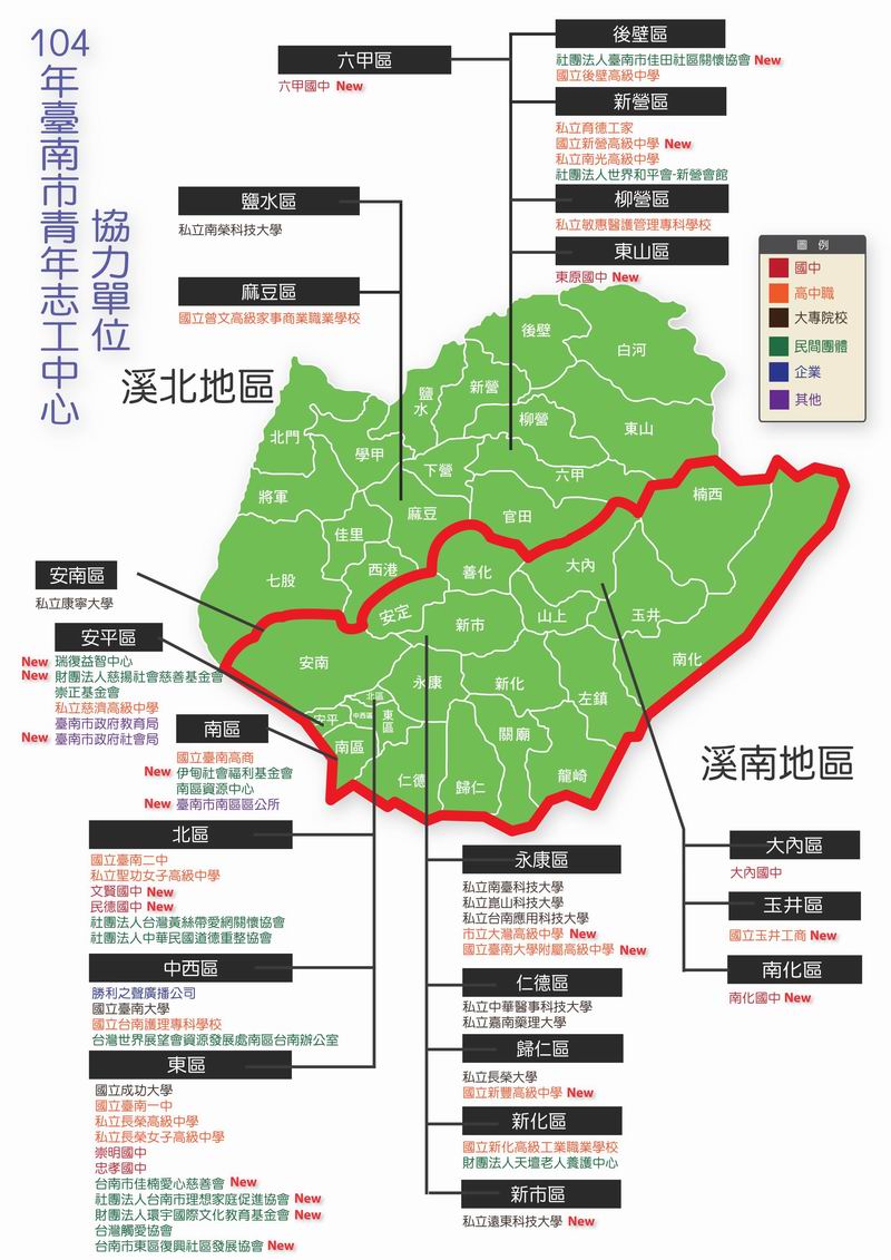 俊逸文教基金會(以下簡稱本會)自102年起承接教育部青年發展署委託成立「臺南市青年志工中心」,為加強與在地學校橫向聯繫,有效流通整合青年志工相關資訊,提升合作可能,由於今年度專案至12月31日即將告一段落(兩年一標),這兩年非常感謝各單位的支持與配合(下圖為今年度曾與志工中心配合的協力單位,已按行政區域標出,一併感謝!),新年度本會預計繼續申請105年直轄市級「教育部青年發展署青年志工中心」之臺南市青年志工中心案,期盼各單位繼續給予我們支持。