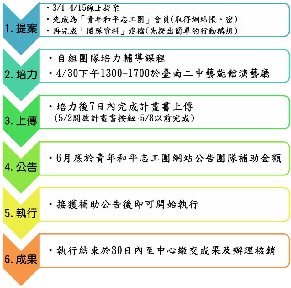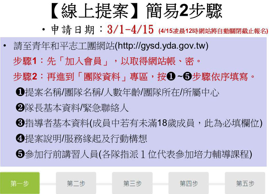 青年和平志工團網站「自組團隊」線上申請,申請期間如下: