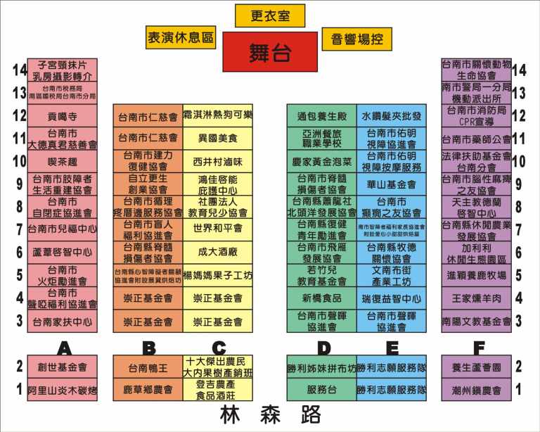 3.面對舞台,右邊帳篷的音響區是【下一組準備區】;左邊的帳篷是【表演休息區】參賽隊伍可以在這裡休息;舞台後方的帳篷是【更衣室】。