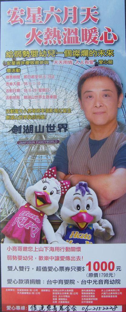(6月1日至6月30日持愛心票券於劍湖山世界主題樂園入園時,1張票券可兌換1張價值500元折價券,此500元折價券於園區內消費時,可依不同商品折價不同金額,例如,冰棒1支20元,持折價券可折價10元,故只需支付10元),或者參與6月28日(週日)由藝人小亮哥率領的舞台表演、摸彩、敲愛心鑼、高歌一曲獻關懷..等等系列活動。