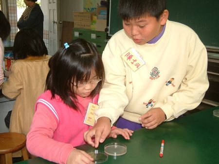 土城國小五年級的陳士元頭頭是道的指出,手上有很多細菌,手指上的細菌留在培養冊裡每天成長,可以觀察出洗手前和洗手後的細菌多寡,雖然他的培養皿裡還看不出任何異樣,不過他相信應該是洗手前的手指上會有較多的細菌,因此培養出來的細菌量會比較可觀。