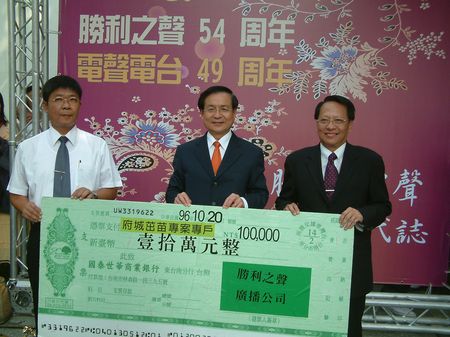 「勝利電聲大代誌」勝利之聲廣播公司五十四週年暨電聲廣播電台四十九週年台慶週六96/10/20登場。勝利之聲廣播公司今年捐贈十萬元給台南市政府茁苗專案,幫助茁苗專案的學童,也於開幕典禮中舉行捐贈儀式,由勝利之聲廣播公司總經理李明威代表將善款捐贈給台南市長許添財。