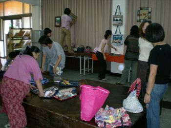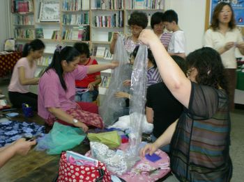 家裡開布店的李秋瑢則是少數有裁縫概念學員,學員常常跟她們家買布,她自己也愛由倉庫裡翻出一堆布料來跟大家分享。她說,當初她就是覺得創意拼布班不買材料包的作法很好,這樣她從倉庫裡找出來的布,剪剪縫縫就成了相當美麗的作品。而且老師教法很活潑,強調自己創作,而不是統一材料包,大家都製作一樣的東西。