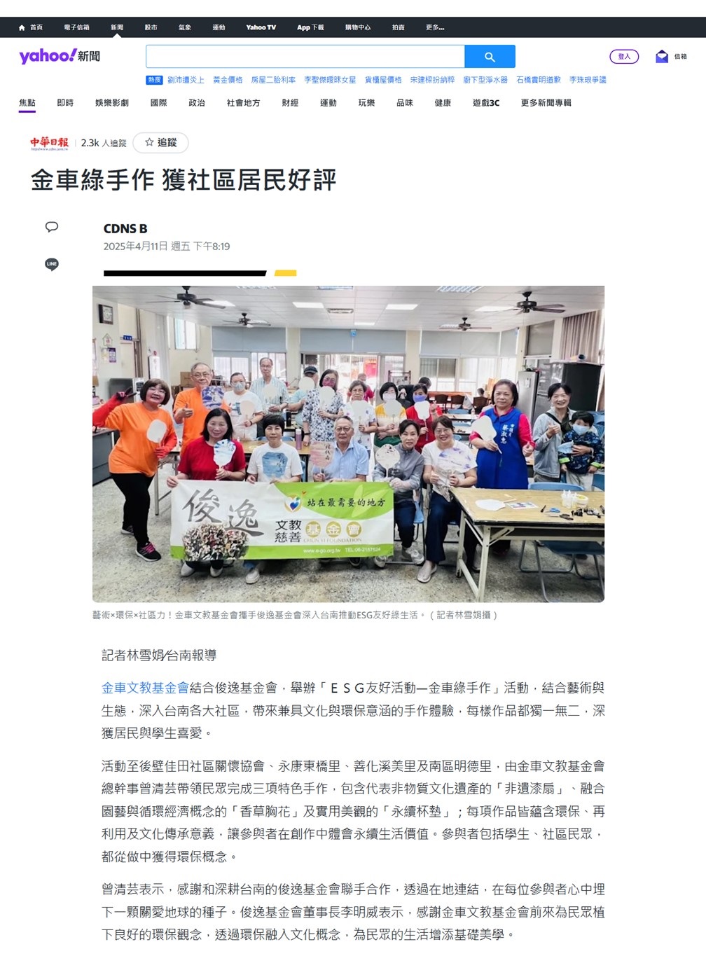 むYAHOO新聞め金車綠手作 獲社區居民好評::俊逸文教基金會::