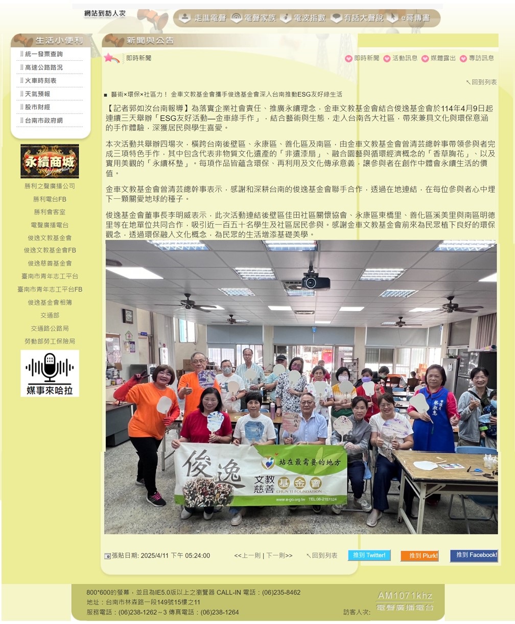 む電聲廣播電台め藝術×環保×社區力! 金車文教基金會攜手俊逸基金會深入台南推動ESG友好綠生活::俊逸文教基金會::