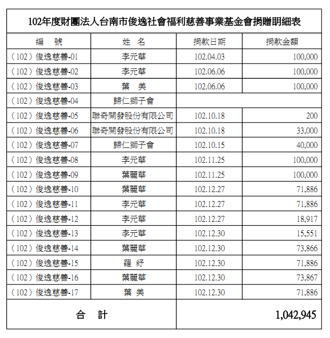 財團法人臺南市俊逸社會福利慈善事業基金會102年捐贈責信::俊逸文教基金會::