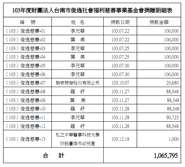 財團法人臺南市俊逸社會福利慈善事業基金會103年捐贈責信::俊逸文教基金會::