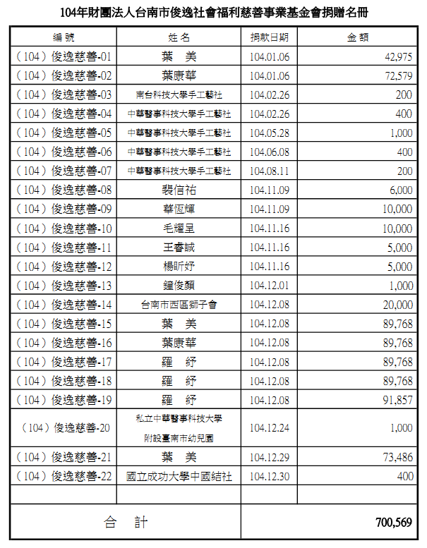 財團法人臺南市俊逸社會福利慈善事業基金會104年捐贈責信::俊逸文教基金會::