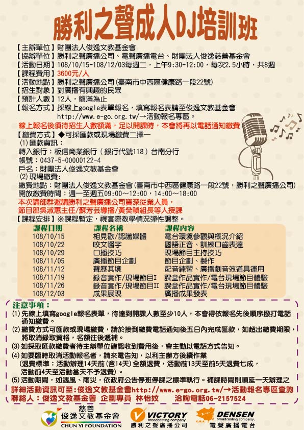 【培訓地點】勝利之聲廣播公司(臺南市中西區健康路一段22號)