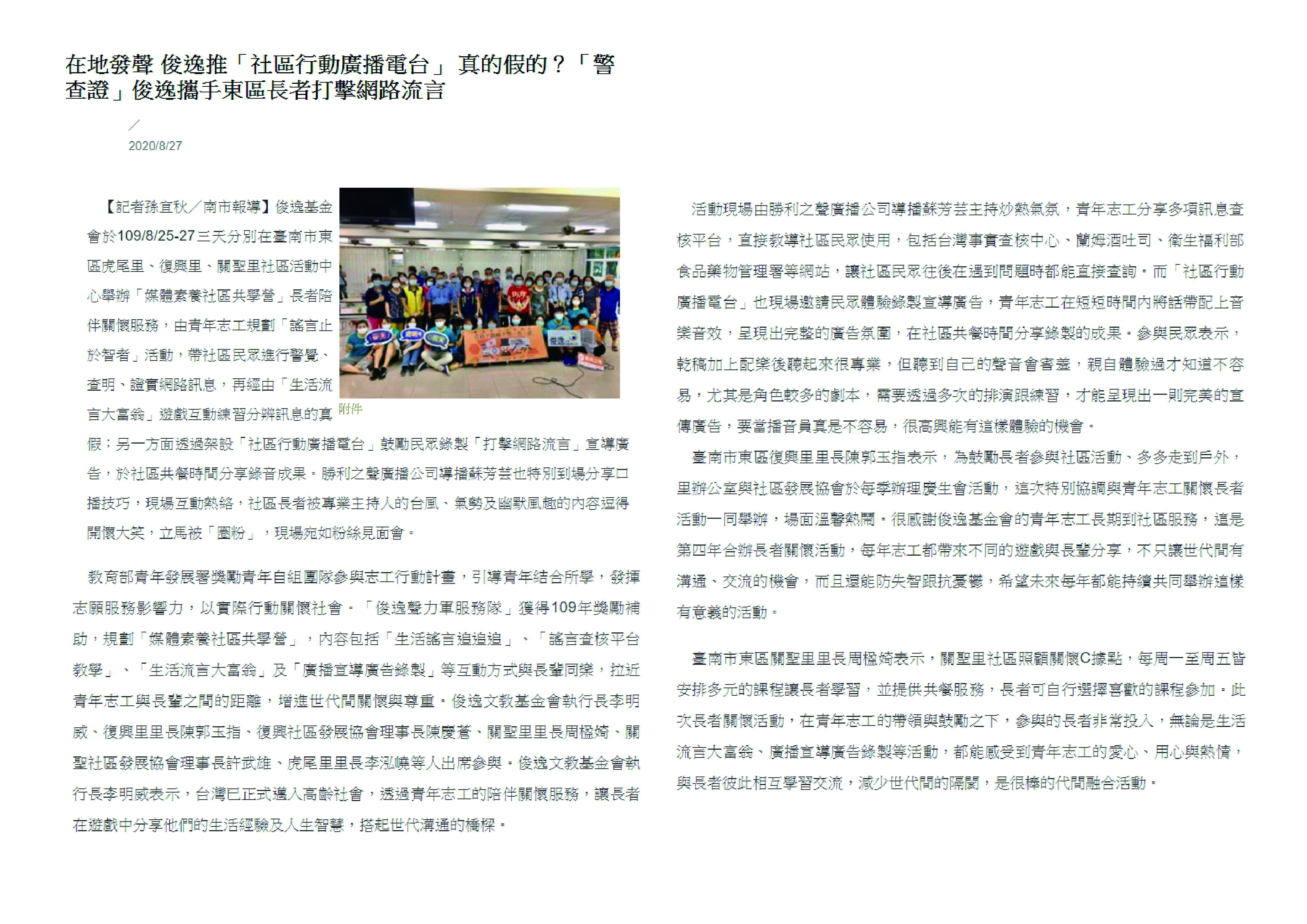 民時新聞 在地發聲 俊逸推「社區行動廣播電台」 真的假的?「警查證」俊逸攜手東區長者打擊網路流言::俊逸文教基金會::