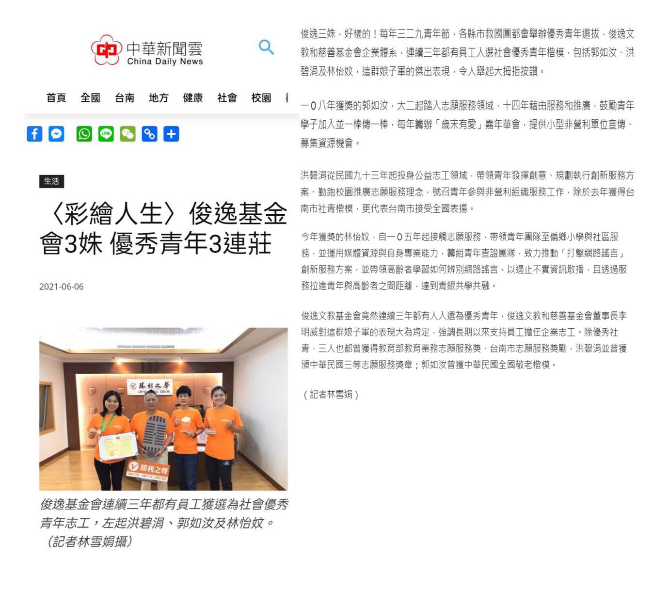 文章出處 : 〈彩繪人生〉俊逸基金會3姝 優秀青年3連莊 | 中華日報|中華新聞雲 (cdns.com.tw)