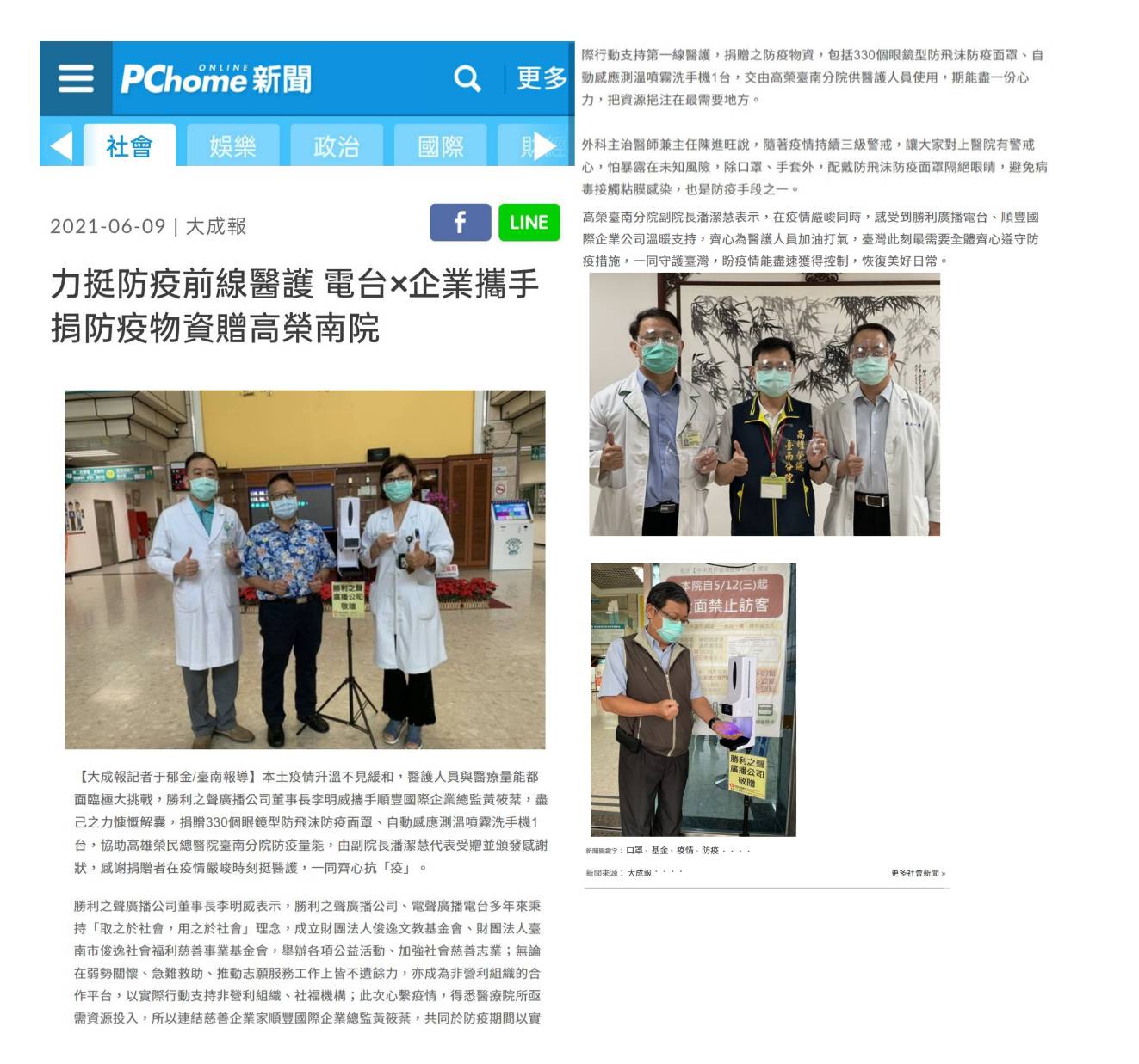 文章出處 : 力挺防疫前線醫護 電台×企業攜手捐防疫物資贈高榮南院 - 社會新聞 - PChome 新聞