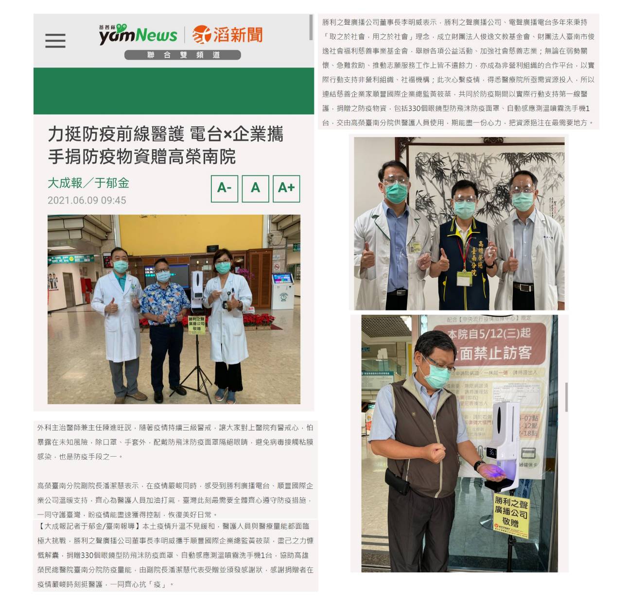 文章出處 : 力挺防疫前線醫護 電台×企業攜手捐防疫物資贈高榮南院 | 蕃新聞 (yam.com)