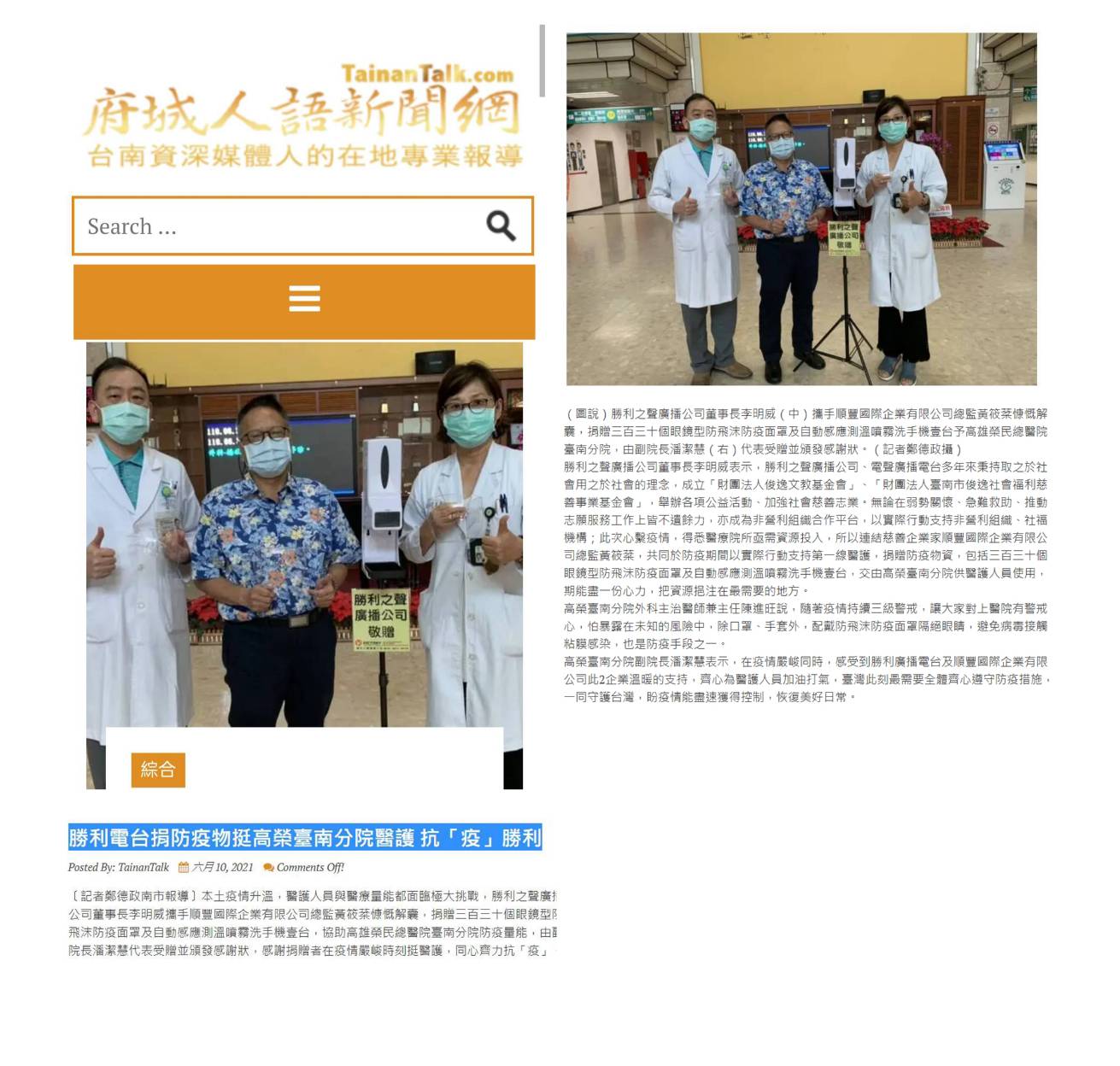 む府城人語新聞網め勝利電台捐防疫物挺高榮臺南分院醫護 抗「疫」勝利::俊逸文教基金會::